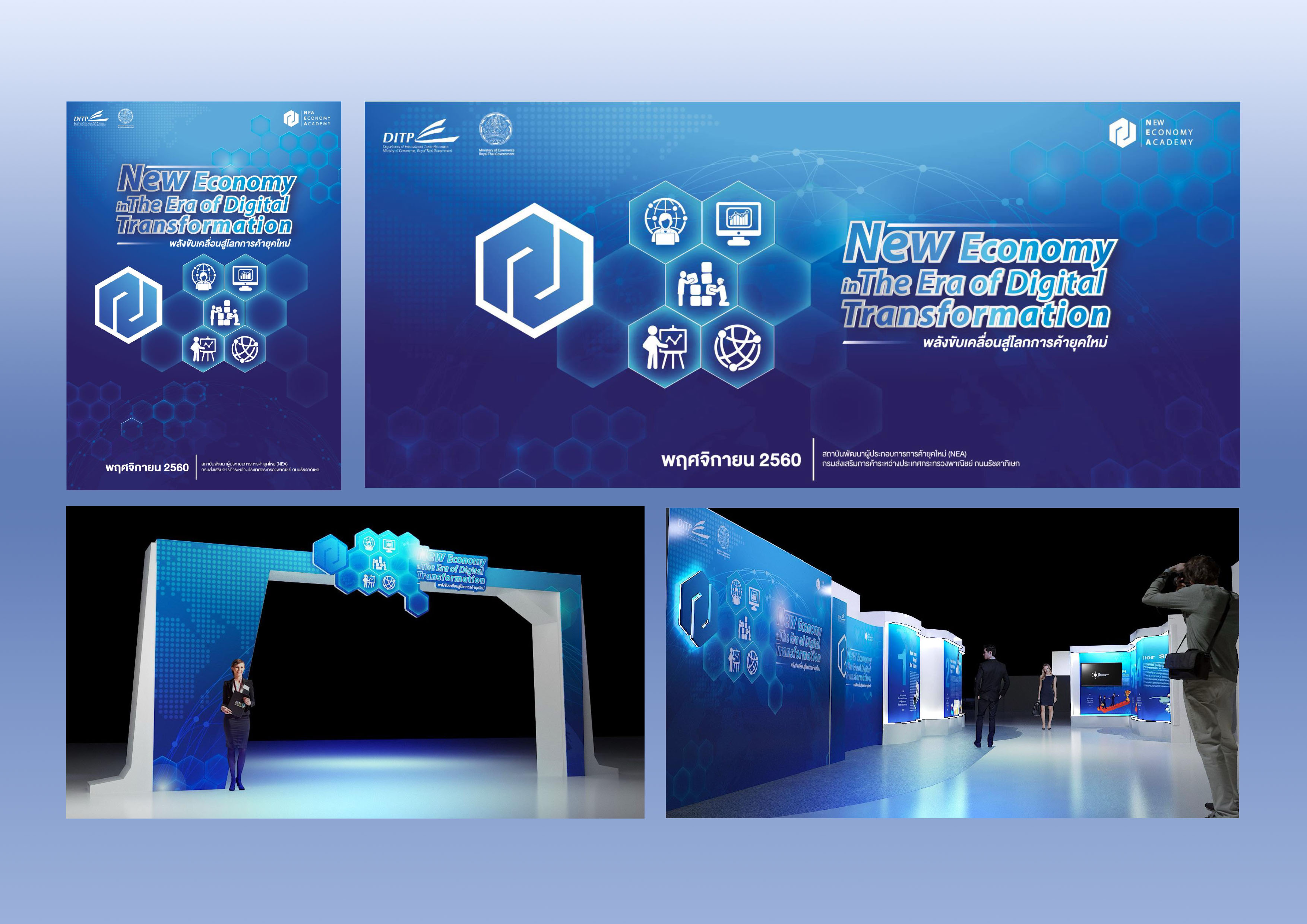 I designed the branding, visual identity, event signage, and exhibition graphics for the NEA’s “New Economy in the Era of Digital Transformation” initiative. The work communicates Thailand’s shift toward digital trade, presenting a modern, technology-focused visual system that supports NEA’s mission to empower Thai entrepreneurs and exporters for the global digital economy.