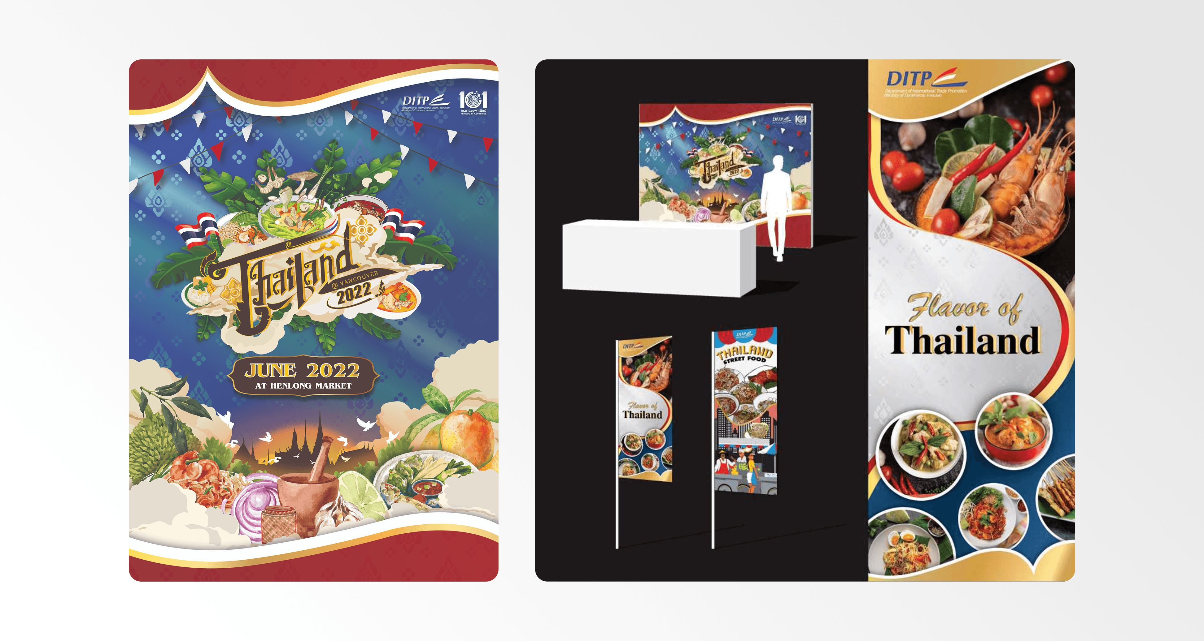Created promotional materials for the Department of International Trade Promotion, Ministry of Commerce, Thailand, for the Thai Food Festival 2022. This project, my first in Canada, showcased Thai culture and cuisine through vibrant poster and brochure designs. I blended traditional Thai motifs with modern aesthetics to create eye-catching visuals that engaged the audience.