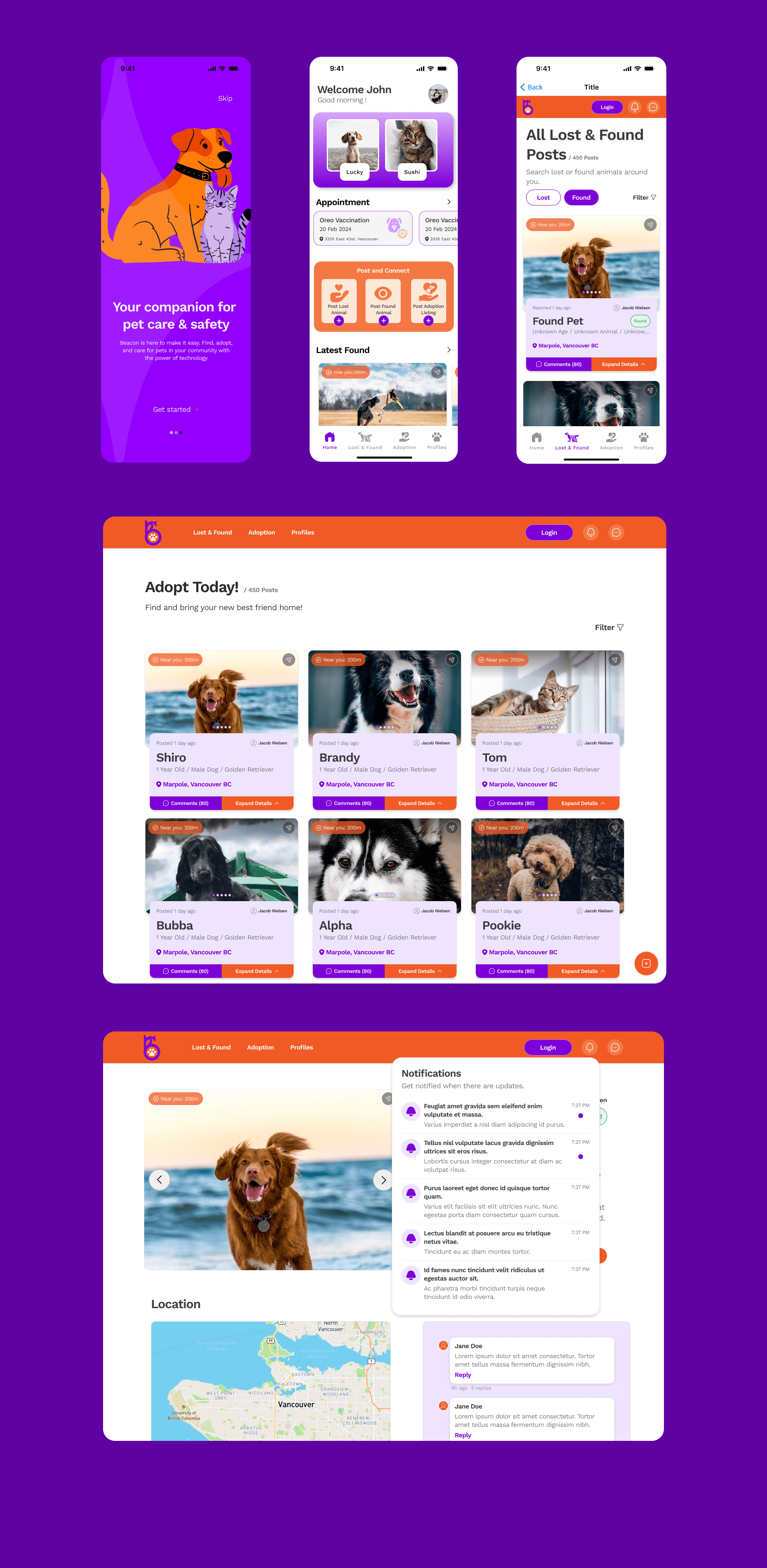 a mobile app that helps reunite lost pets and support adoptions through local, real-time updates and community alerts.