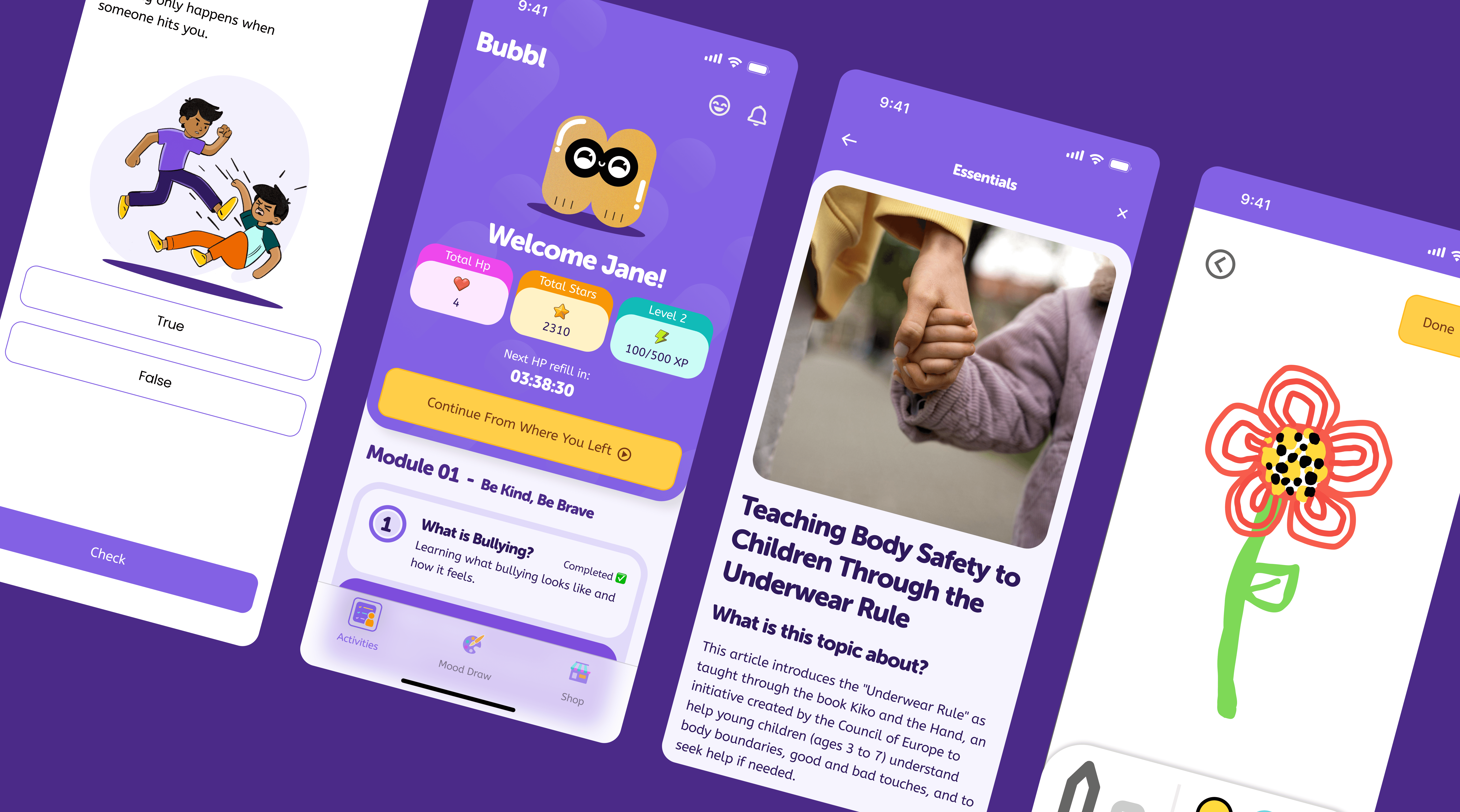 Bubbl is a kid-friendly app that helps children learn about emotions, body safety, and personal boundaries through interactive stories, drawing, and a playful mascot.