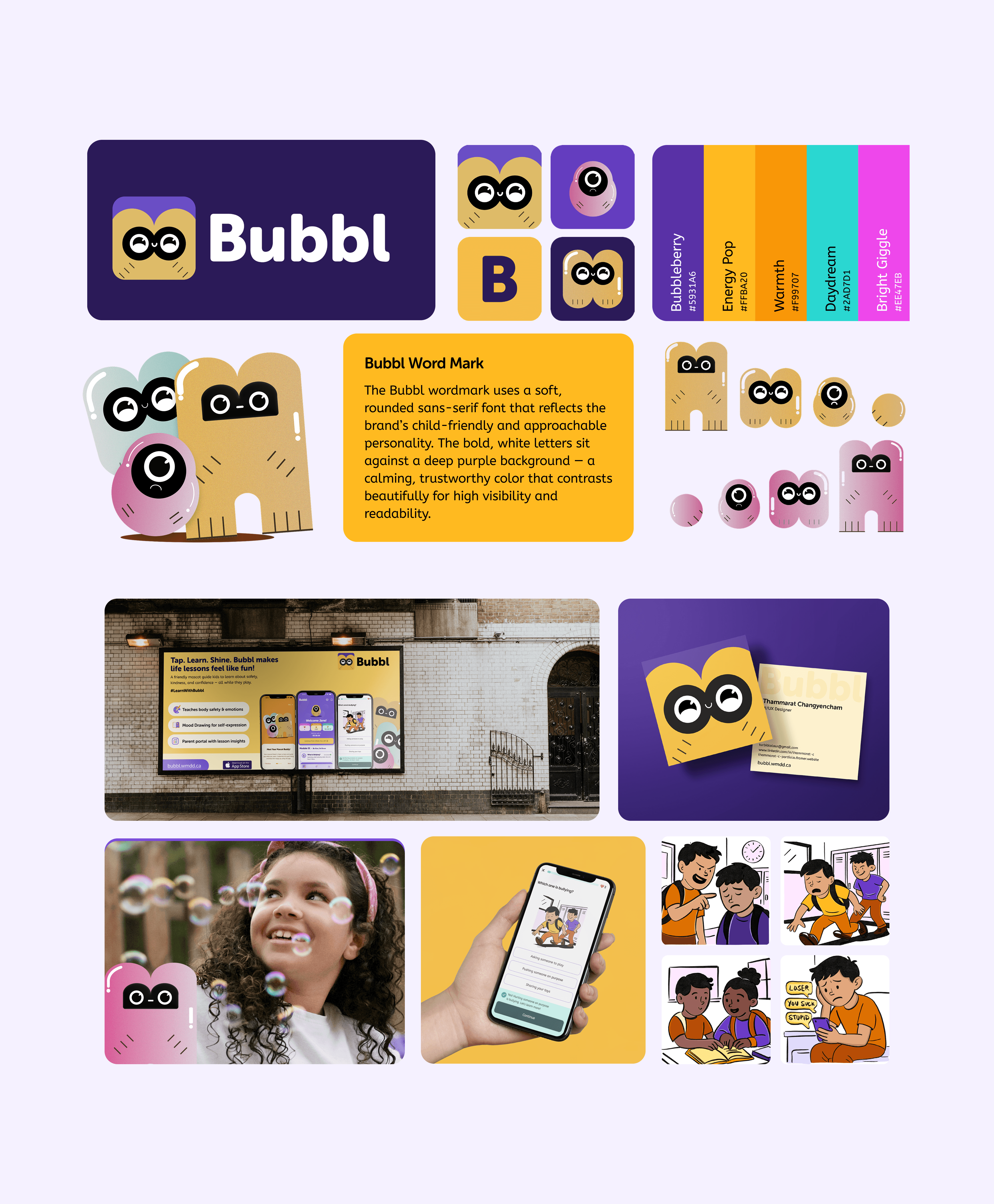 Designing Bubbl taught me how to approach sensitive topics like emotional safety with empathy and creativity. One of the main challenges was making complex ideas like boundaries and feelings, simple and engaging for young users. I explored child-friendly UI, soft colour palettes, and interactive mascots to create a safe and playful experience.