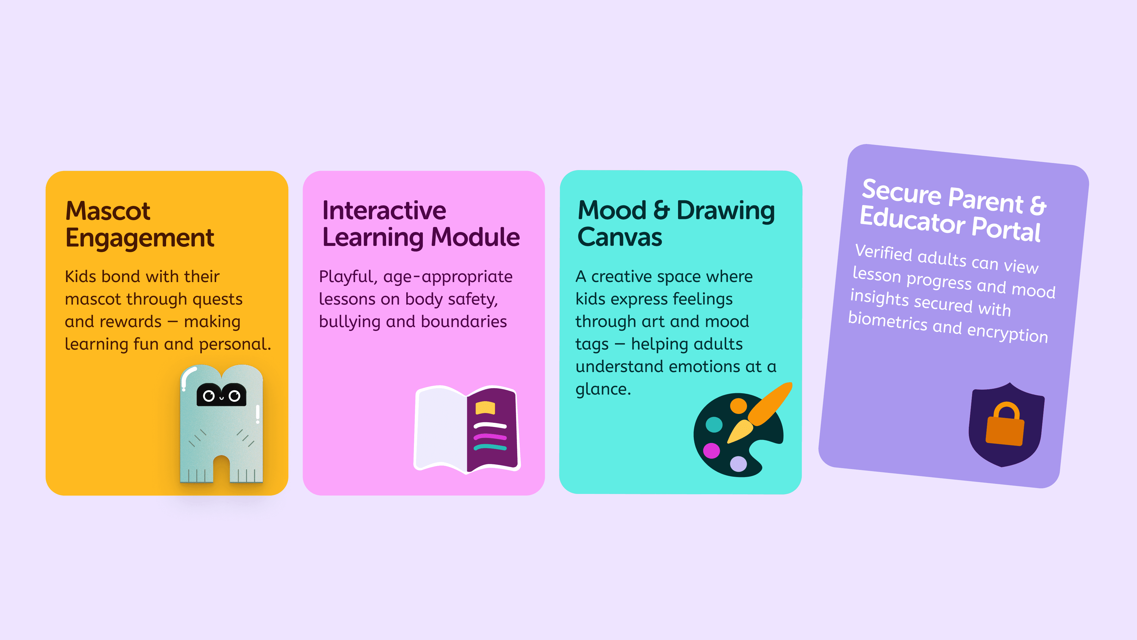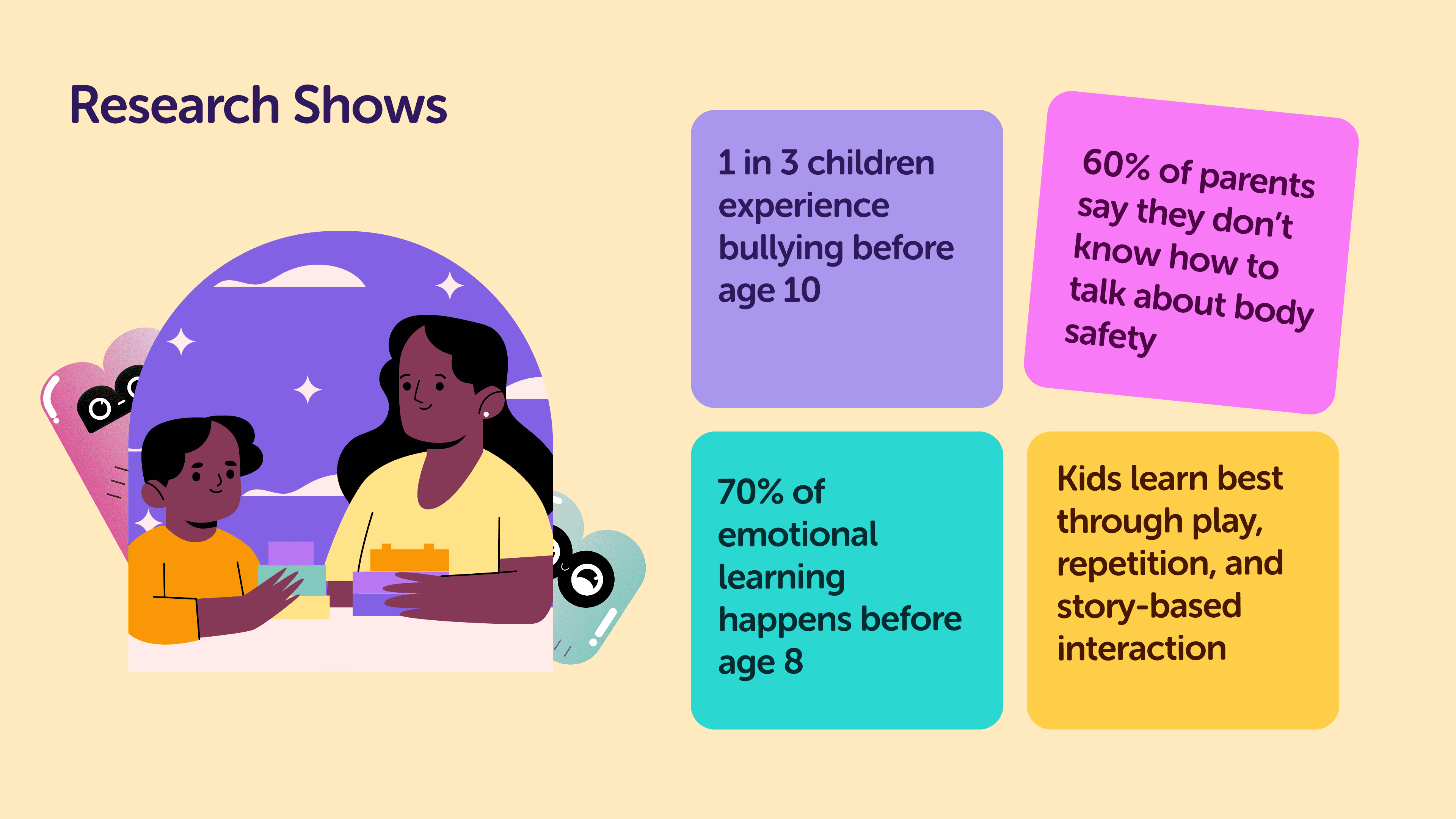 Young children often struggle to express complex feelings or understand personal boundaries—especially around sensitive topics like bullying or body safety. Parents want to support their kids emotionally but often lack age-appropriate tools and confidence to start these conversations. Existing resources are either too clinical, too passive, or not built for regular, shared use between child and parent.